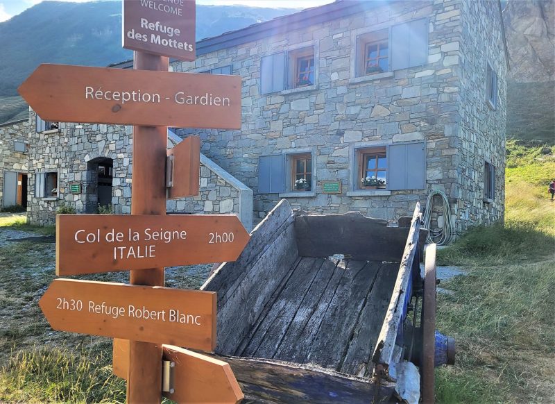 Azi avem în plan trecerea în Italia, vreo 13 km, derulați de-a lungul a 6 ore, 995 metri urcare și vreo 384 de coborâre până la Rifugio Elisabeta. Sau cel puțin așa spunea harta. După câteva studieri pe net, am hotărât să trișăm fără nerușinare cu ajutorul unui bus ce ne ducea până la Refugiul Des Mottets, nu de alta dar între cele două refugii traseul era pe drum și pe mine mă cam seacă bucățile astea. Salvăm astfel vreo 300 de metri de urcare, o oră jumate și 6 km. La ora 9 când a parcat busul și am văzut că era plin, m-am simțit mai bine, recunosc. Până la Des Mottets am făcut vreo 20 de minute, pe un drum îngust, într-o parte stâncă, în cealaltă prăbușelniță, felicitându-mă că nu stau să înghit praful după fiece mașină ce trece. La Des Mottets, ne-am cam luat pe noi hainele de rezervă din rucsac, că trăgea un țug, mai să-mi zboare dramul de freză spălată cu greu ieri în râul din Chapieux. Așa că am rezolvat situația cu un buff, pe care nici nu mi l-am mai dat jos până la următorul duș.