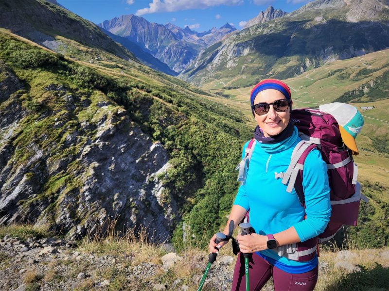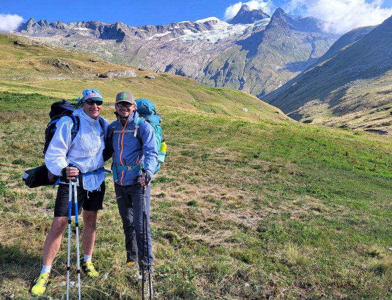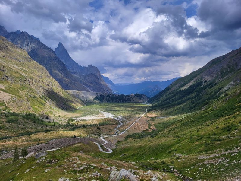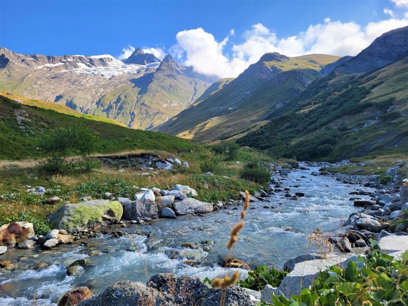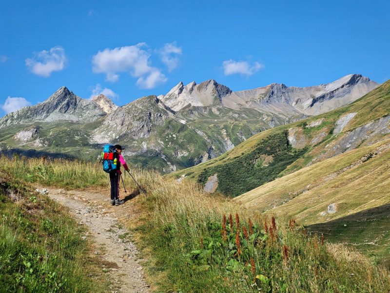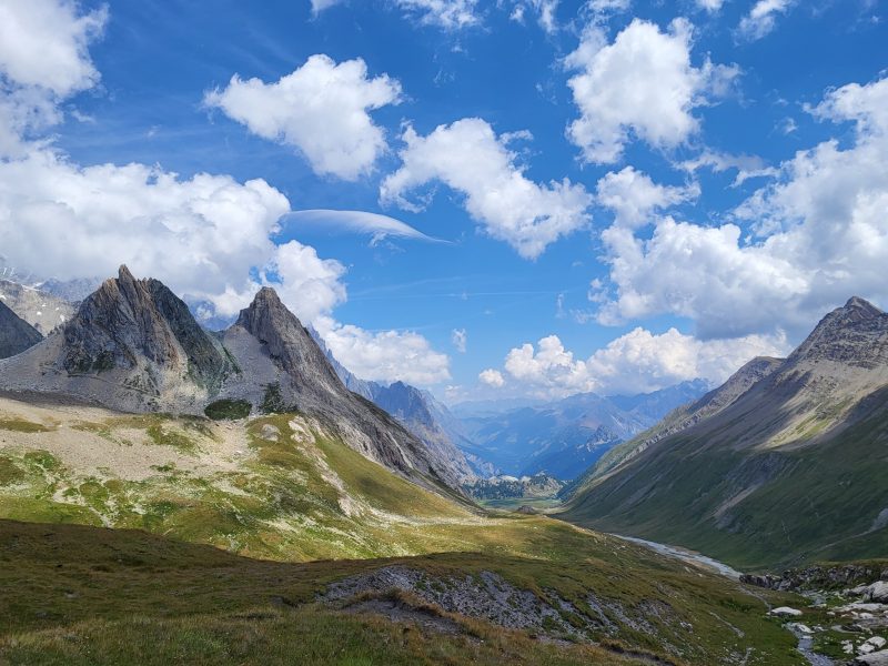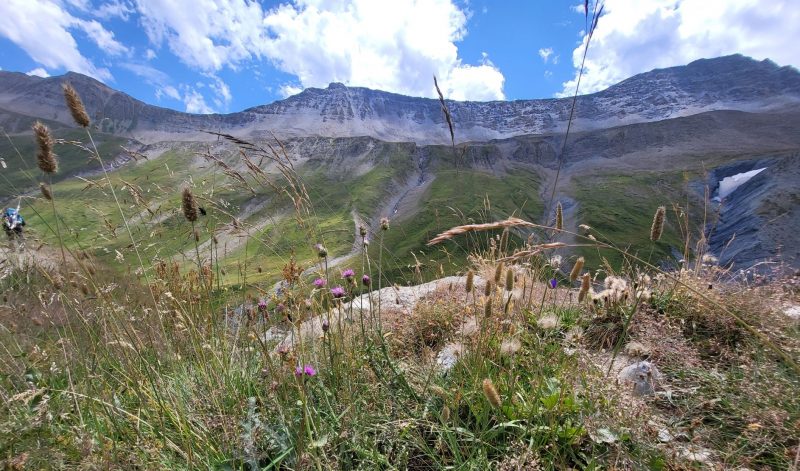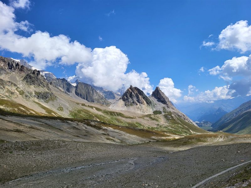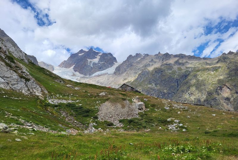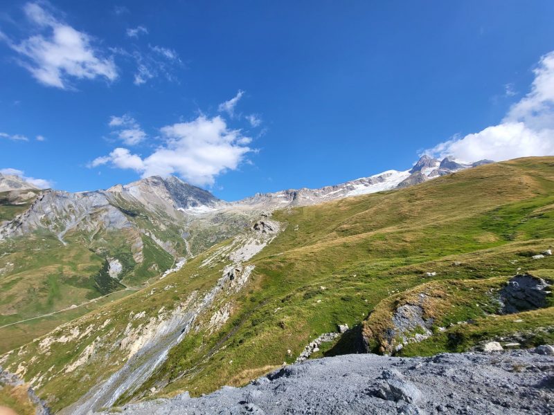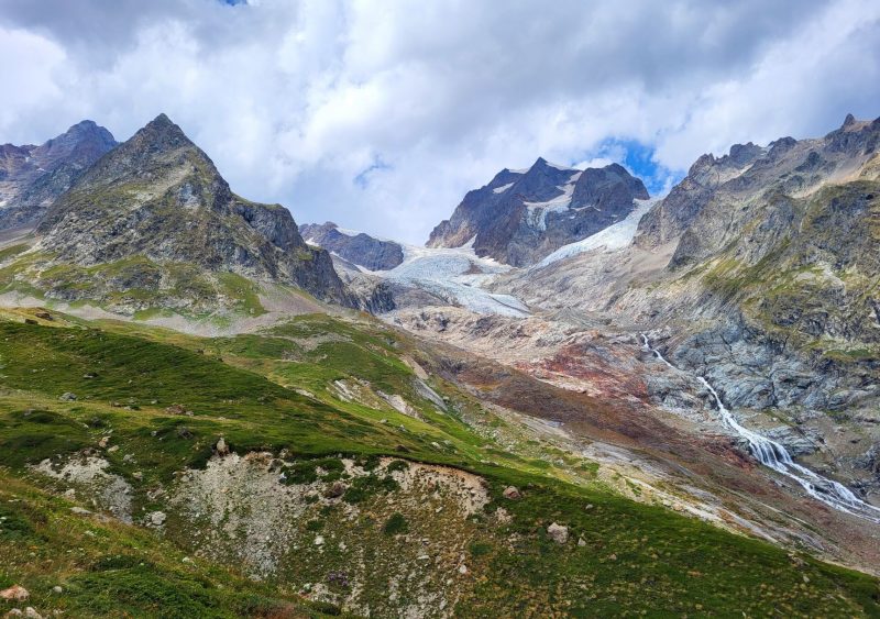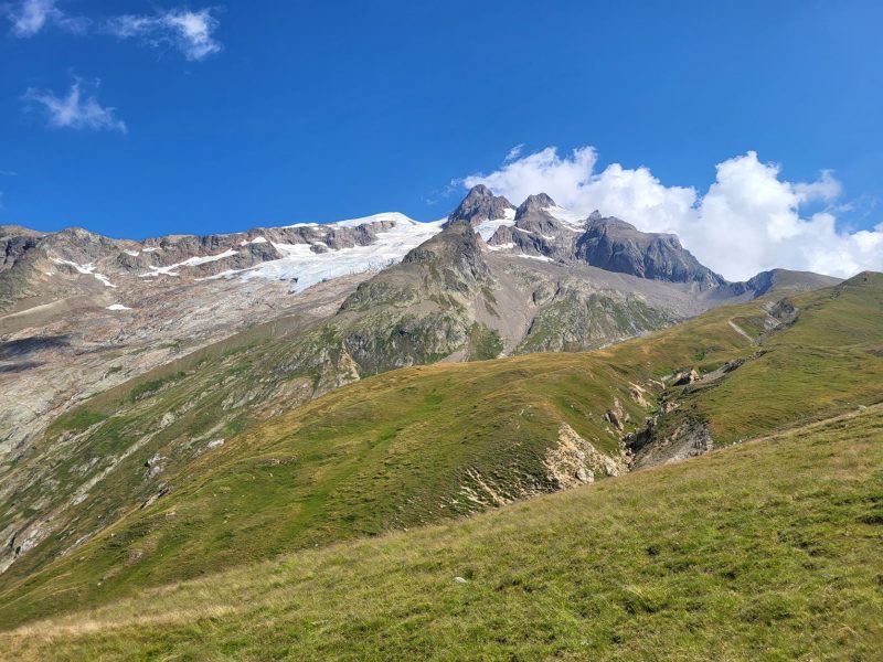 Eram deja la 1900 metri altitudine și în fața noastră făceau paradă ghețar după ghețar, vârf după vârf. Traseul desigur că începe cu urcare, cum altcumva, că doar trebuia să ajungem până în Col de la Seigne la 2516 m, așa că hai Mihaelo, lasă freza, selfiurile și bagă mare! Urcarea e continuă dar nu abruptă și oricum la cât de mișto e totul în jurul tău nu simți efortul. Mă obișnuisem și cu povara celor 10 kile din spate așa că eram pe val. Pe măsură ce urcam priveliștea era tot mai spectaculoasă. În stânga ne acompania Mont Tondu cu cei 3192 de metri, urmat de Aguille des Lanchettes avântat până la 3073 metri și Aguille des Glaciers cu cei 3815 metri. Între ei stăteau atârnați ghețarii Glacier D’Enclave, Des Lanchettes și impresionantul Glacier des Glaciers sau mai exact tata lor. În spate, departe tare, Le Roignais, Pic Bayle și alți coloși.