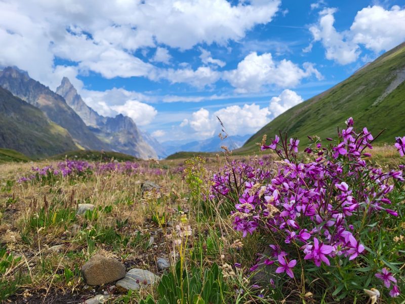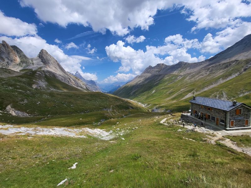 Na și am stat noi cât am stat pe Col de la Seigne dar începea să ne ia foamea și i-am dat viteză pe coborâre. Punctul următor Rifugio Elisabeta. După o coborâre nu foarte abruptă, punctată de câteva marmoțele tare simpatice, traseul te duce pe drept printr-o câmpie culcușită între toți munții cei înalți. În dreapta apă cristalină, în jurul tău plin de flori roz și mov. Ce poți să îți mai dorești de la viață…Hmmm…”o pizza și un roze”, se trezește sindicatul…”și un duș…și un pat… din ăla în care să te pierzi…și o perie de păr”…Măi! Gălăgia! Parcă am făcut un armistițiu acum vreo 3 zile, că mă lăsați să trăiesc și apoi mai negociem!